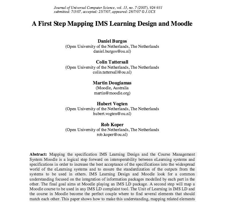 Burgos, D., Tattersall, C., Dougiamas, M., Vogten, H., & Koper, R. (2007). A First Step Mapping IMS Learning Design and Moodle. J. UCS, 13(7), 924-931.