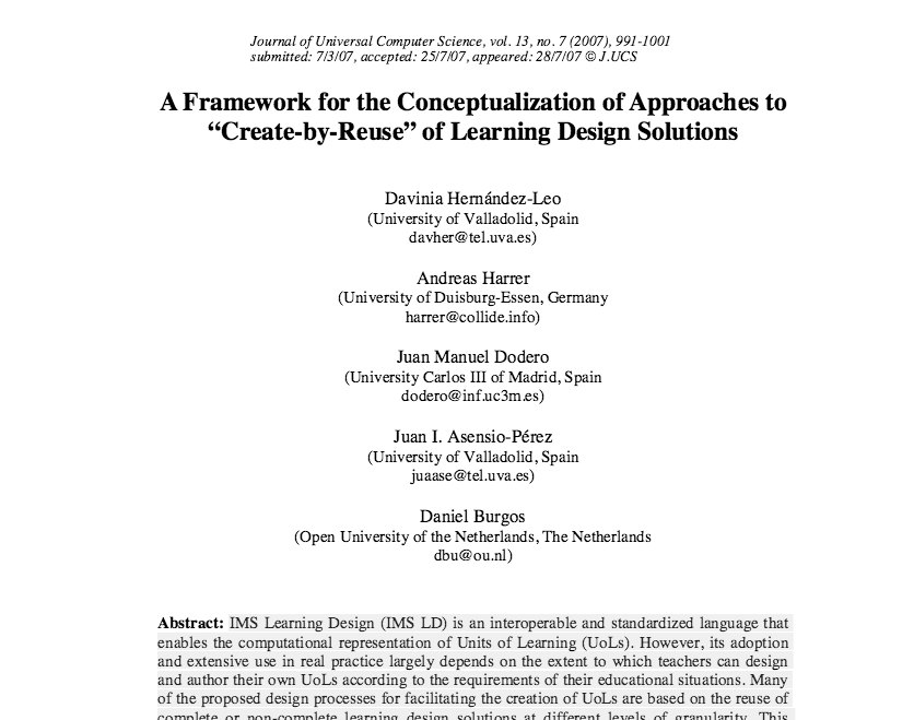Hernández-Leo, D., Harrer, A., Dodero, J. M., Asensio-Pérez, J. I., & Burgos, D. (2007). A framework for the conceptualization of approaches to “Create-by-Reuse” of