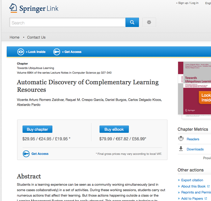 Zaldivar, V. A. R., García, R. M. C., Burgos, D., Kloos, C. D., & Pardo, A. (2011). Automatic discovery of complementary learning resources. Towards Ubiquitous Learning, 327-340.