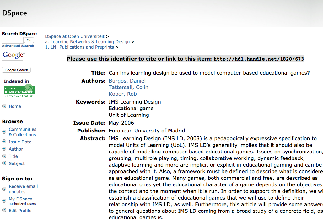 Burgos, D., Tattersall, C., & Koper, R. (2006). Can IMS Learning Design be used to model computer-based educational games?.