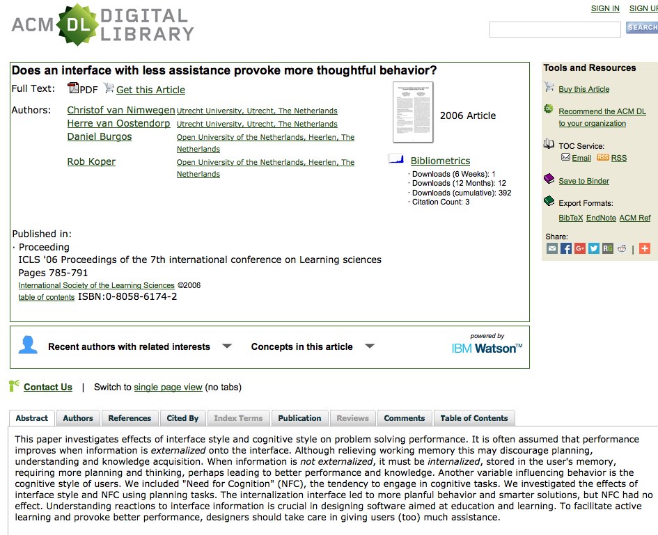 Van Nimwegen, C., Van Oostendorp, H., Burgos, D., & Koper, R. (2006, June). Does an interface with less assistance provoke more thoughtful behavior?. In Proceedings of the 7th international conference on Learning sciences (pp. 785-791). International Society of the Learning Sciences.