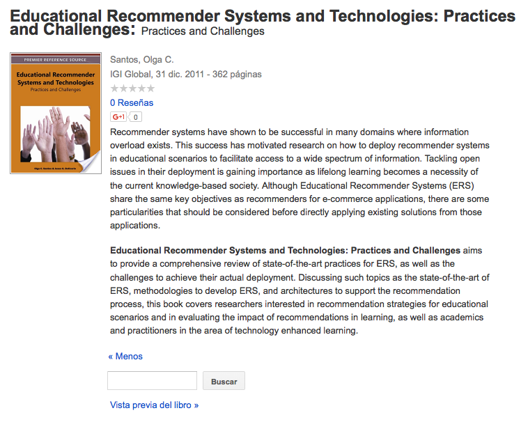 Santos, O. C. (Ed.). (2011). Educational Recommender Systems and Technologies: Practices and Challenges: Practices and Challenges.