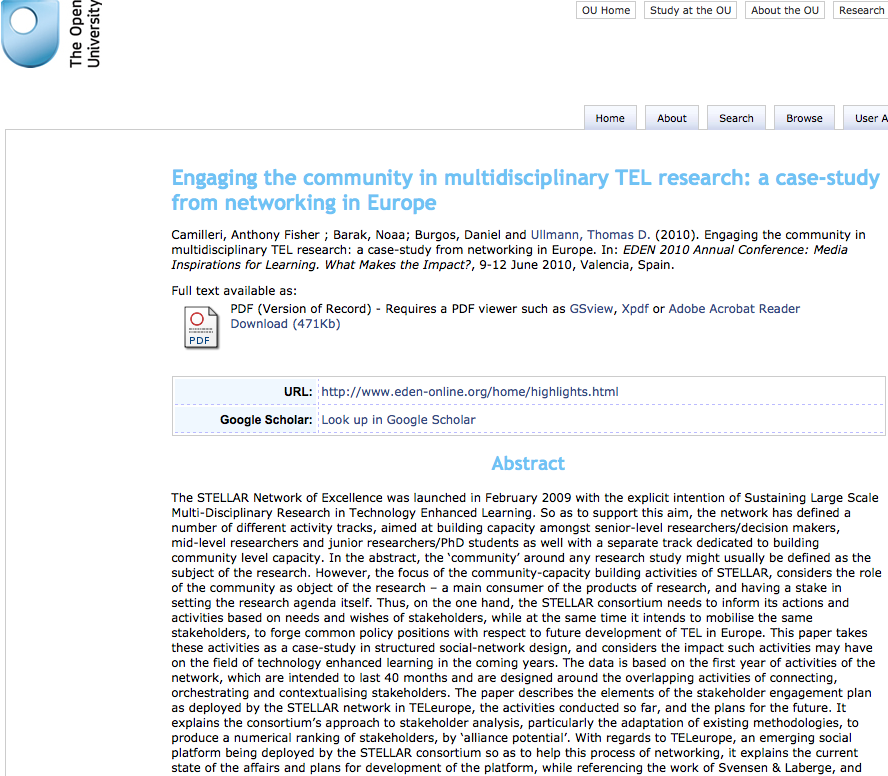 Camilleri, A. F., Barak, N., Burgos, D., & Ullmann, T. D. (2010). Engaging the community in multidisciplinary TEL research: A case-study from networking in Europe.