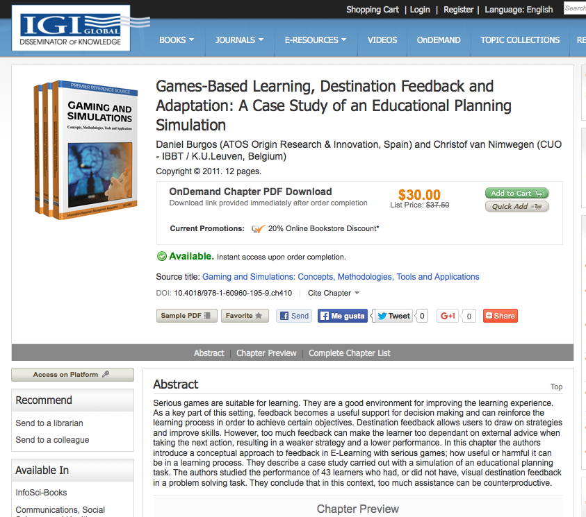Burgos, D., & van Nimwegen, C. (2009). Games-Based Learning, Destination Feedback and Adaptation: A Case Study of an Educational Planning Simulation. T. Connolly, M. Stansfield, & L. Boyle, Games-based learning advancement for multi-sensory human. techniques and effective practices.