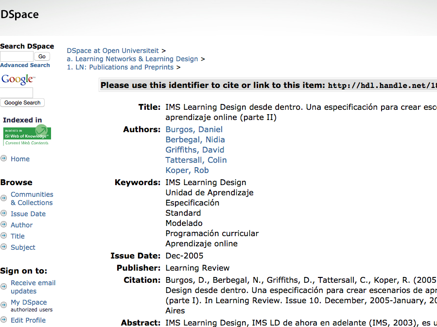 Burgos, D., Berbegal, N., Griffiths, D., Tattersall, C., & Koper, R. (2005). IMS Learning Design desde dentro. Una especificación para crear escenarios de aprendizaje online (parte II).