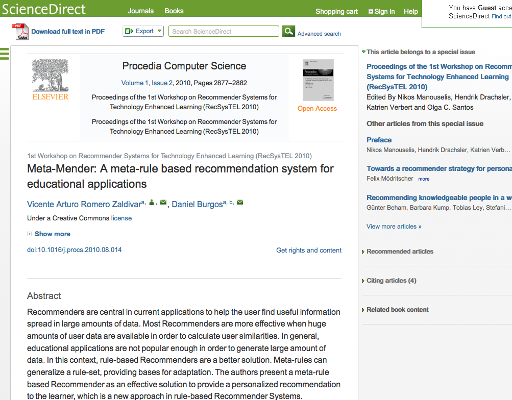Zaldivar, V. A. R., & Burgos, D. (2010). Meta-Mender: A meta-rule based recommendation system for educational applications. Procedia Computer Science, 1(2), 2877-2882.