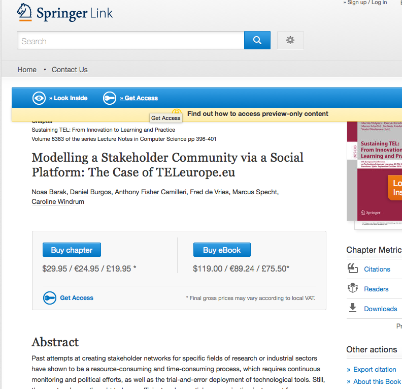 Barak, N., Burgos, D., Camilleri, A. F., De Vries, F., Specht, M., & Windrum, C. (2010). Modelling a stakeholder community via a social platform: the case of TELeurope. eu. Sustaining TEL: From Innovation to Learning and Practice, 396-401.