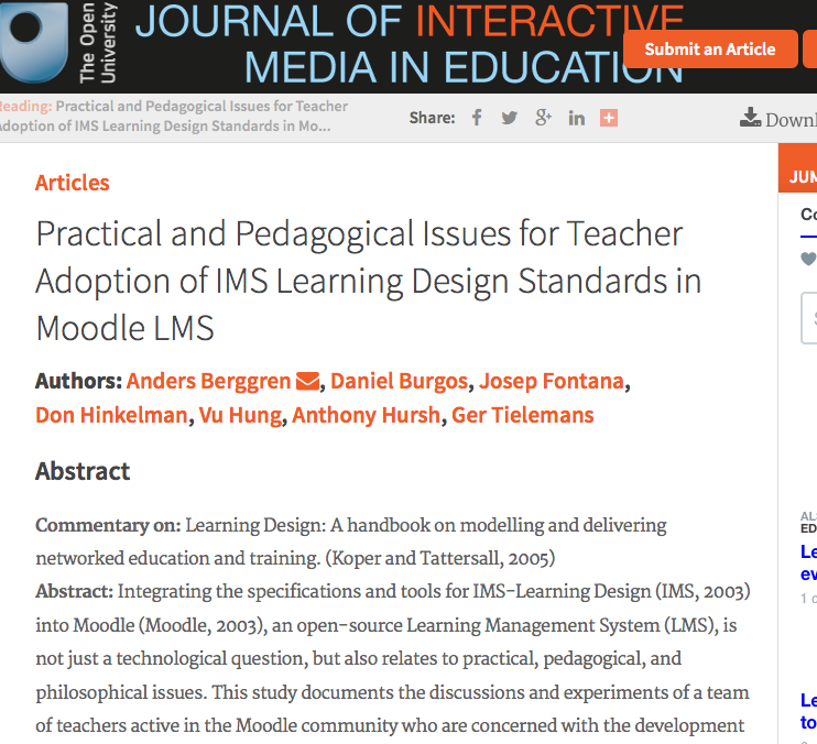 Berggren, A., Burgos, D., Fontana, J. M., Hinkelman, D., Hung, V., Hursh, A., & Tielemans, G. (2010). Practical and pedagogical issues for teacher adoption of IMS learning design standards in Moodle LMS. Journal of Interactive Media in Education, 2005(1), Art-3.