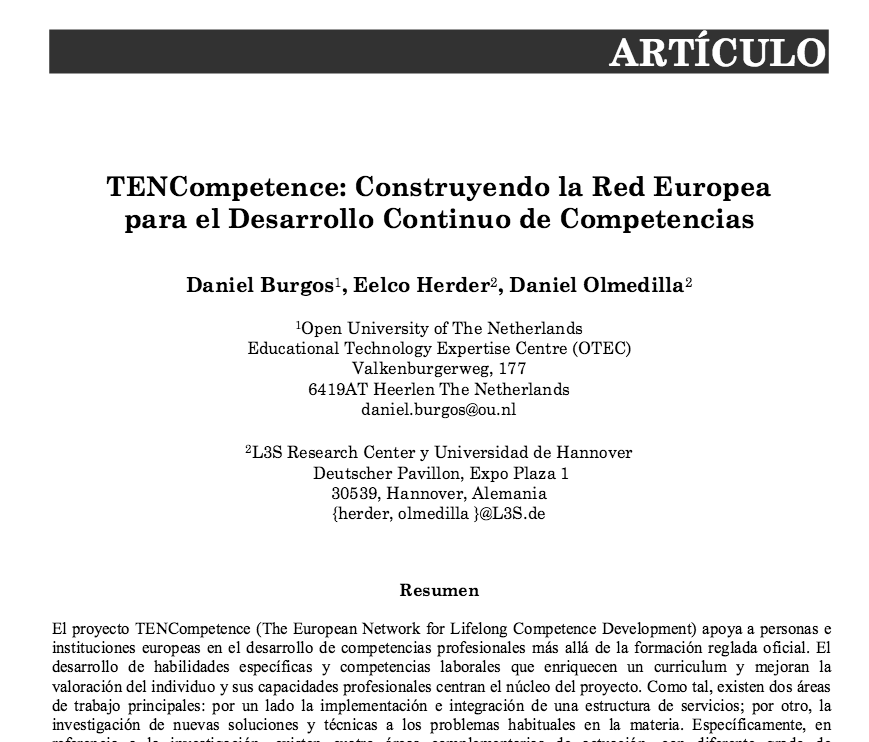 Burgos, D., Herder, E., & Olmedilla, D. (2007). Tencompetence: Construyendo la red europea para el desarrollo continuo de competencias. Inteligencia Artificial, Revista Iberoamericana de Inteligencia Artificial, 11(33), 79-84.
